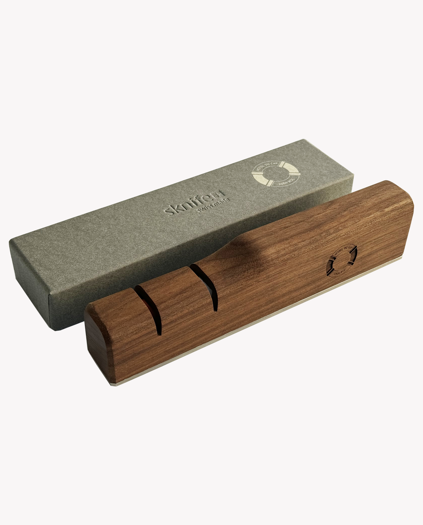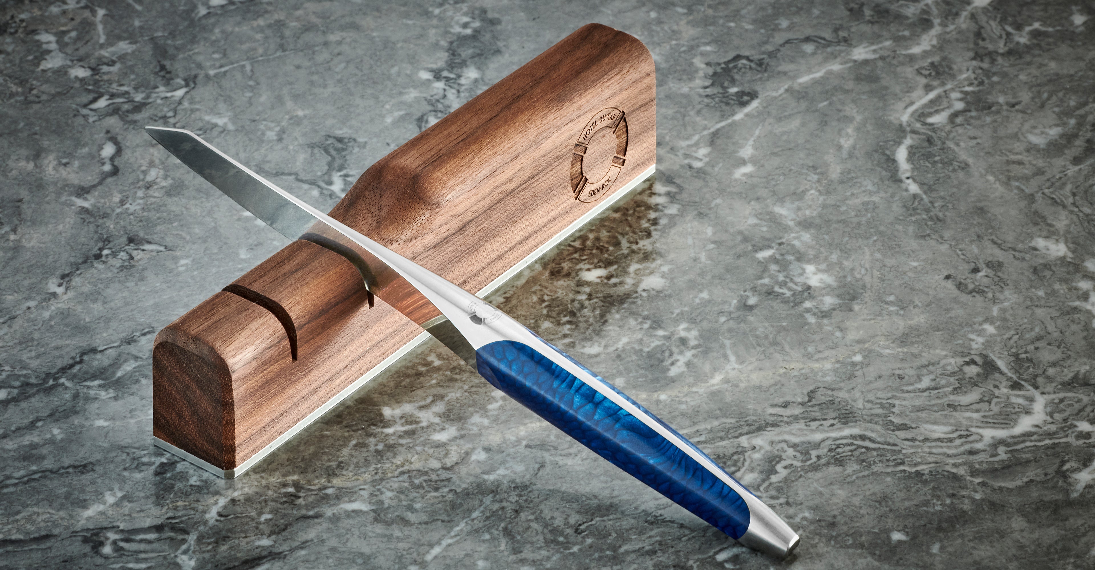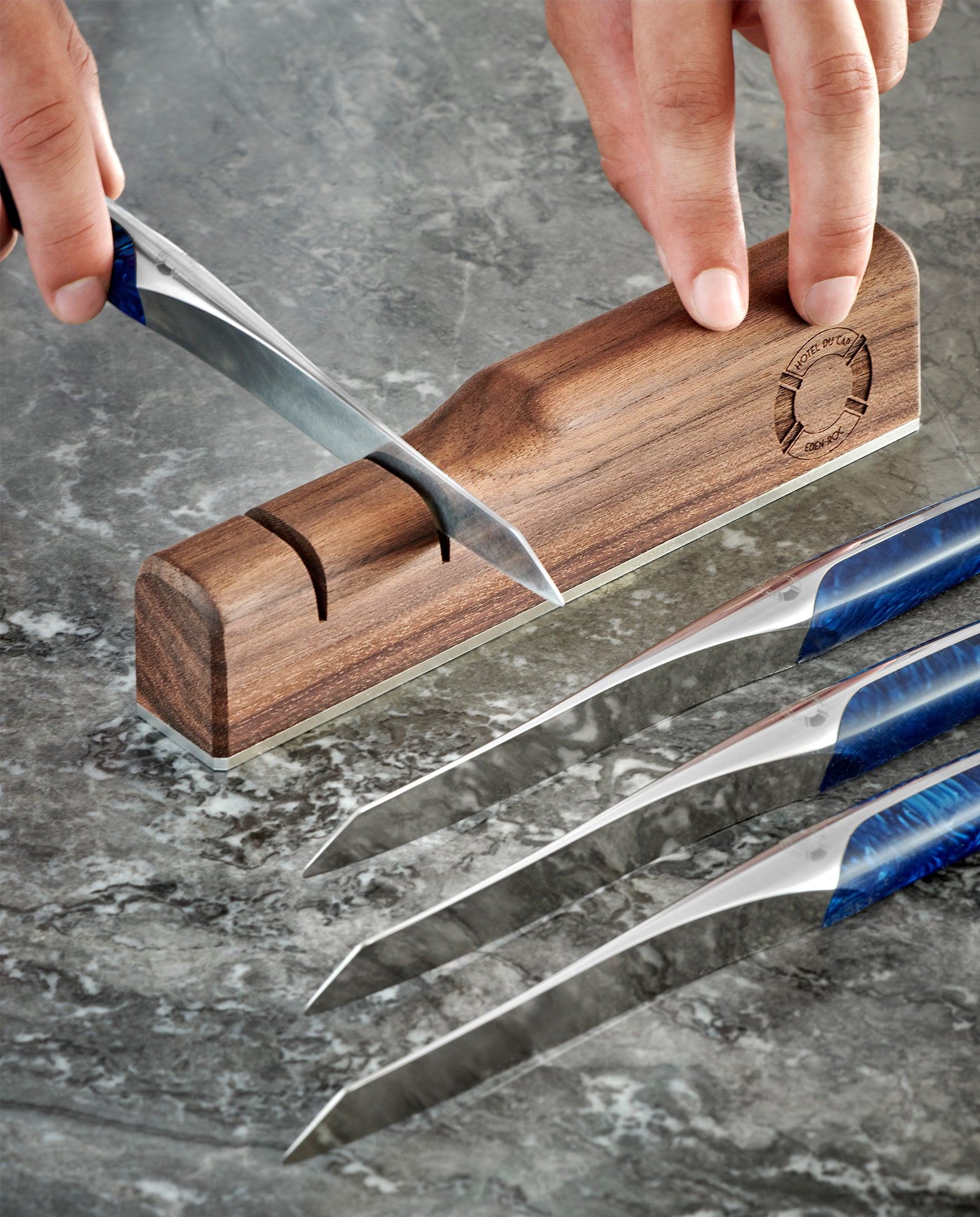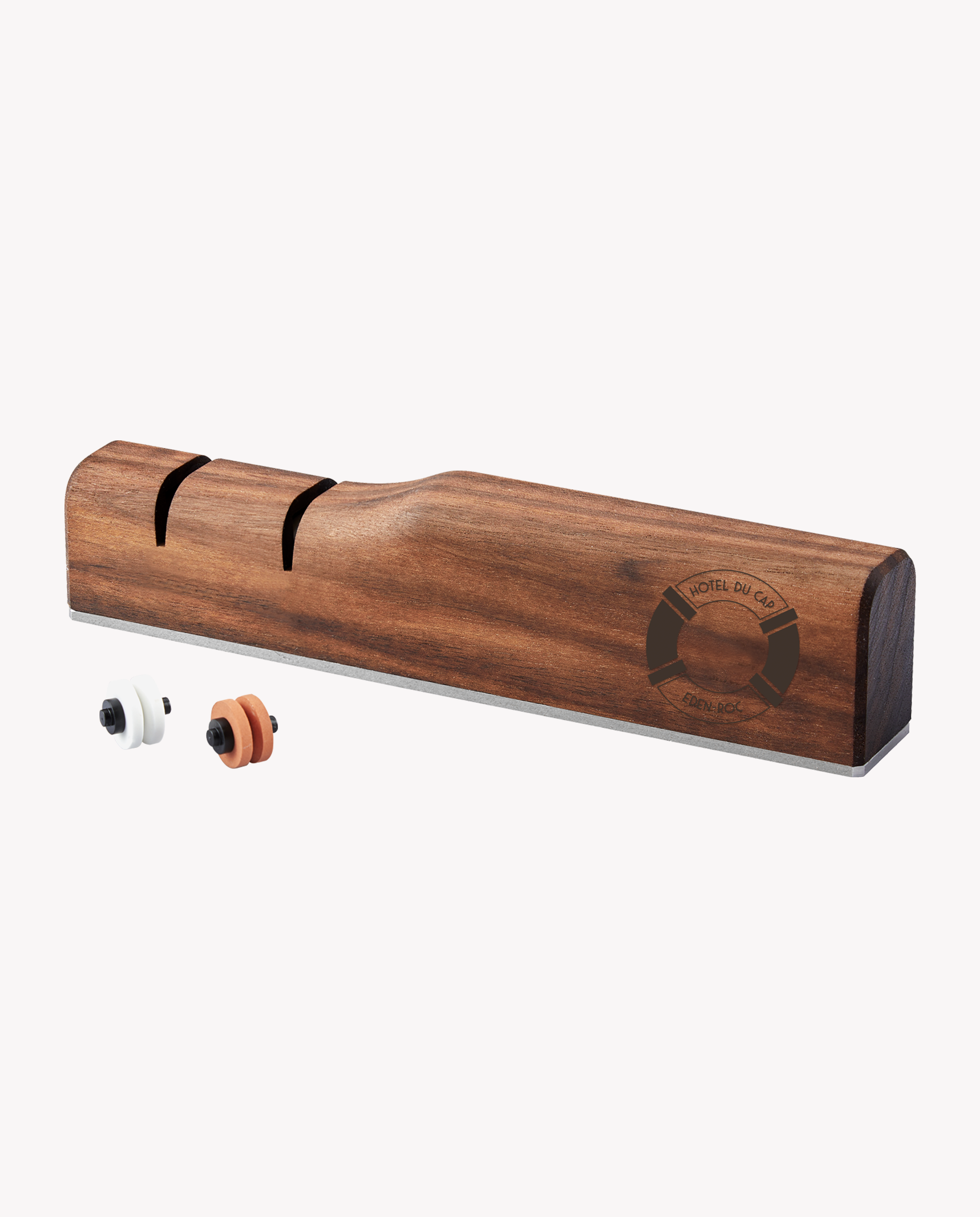 Confectionné sur-mesure avec le logo de l'Hôtel du Cap-Eden-Roc, l'appareil d'affûtage Sknife est un outil essentiel pour préserver le tranchant de vos couteaux à steak. Il suffit de glisser la lame dans cet aiguiseur pour qu'elle retrouve tout son tranchant et permette une découpe sans faille à table.