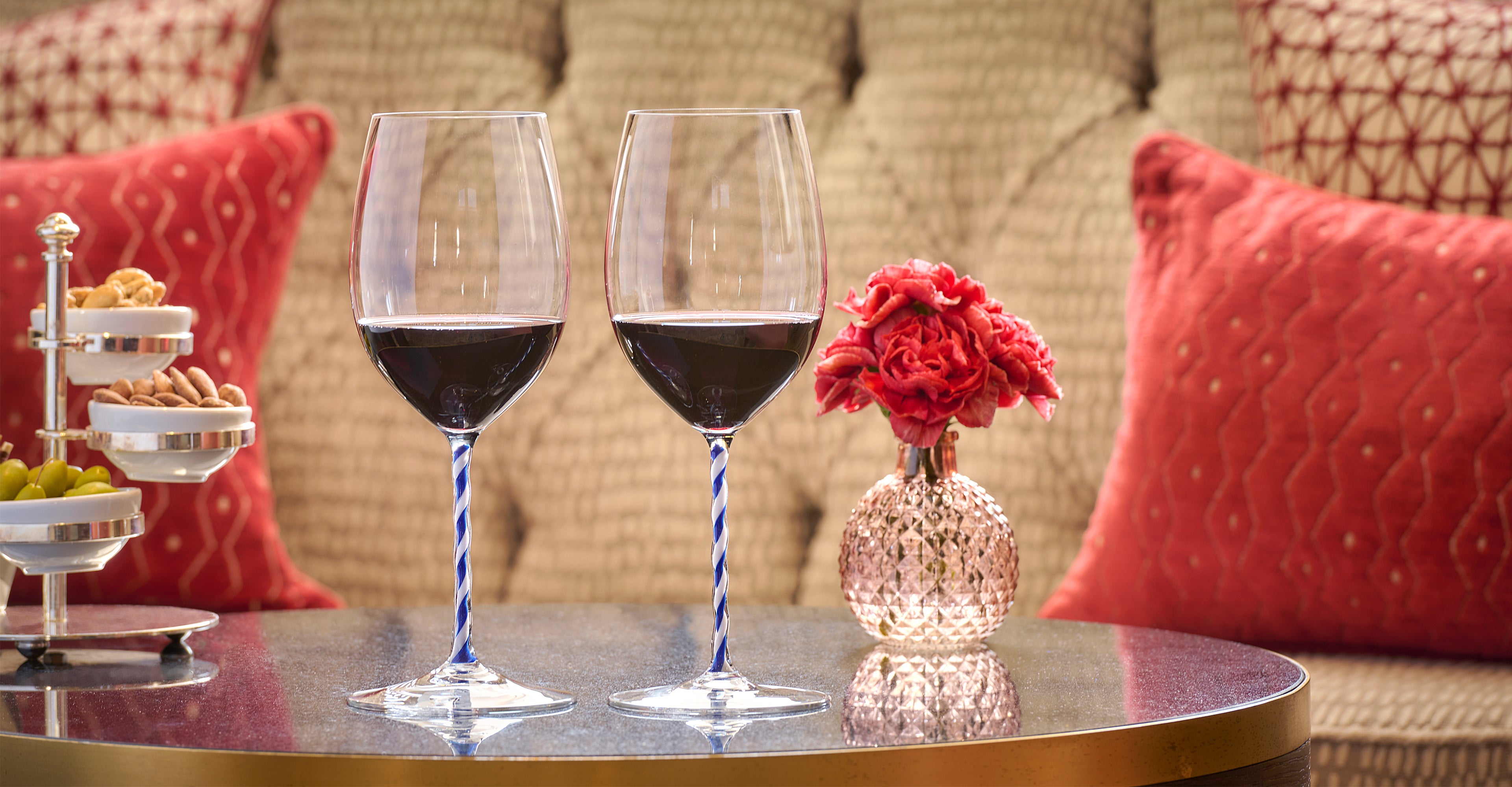 Doté d'un pied en verre soufflé à la main, dont la spirale bleue et blanche rappelle l'Hôtel du Cap-Eden-Roc, le verre à Cabernet Riedel Fatto a Mano est un modèle exceptionnel pour les amateurs d'originalité. Façonné pour sublimer les tanins du Cabernet et du Merlot et permettre aux arômes de se développer pour une dégustation optimale, ce service de verres invite le glamour de la Côte d'Azur à la table.