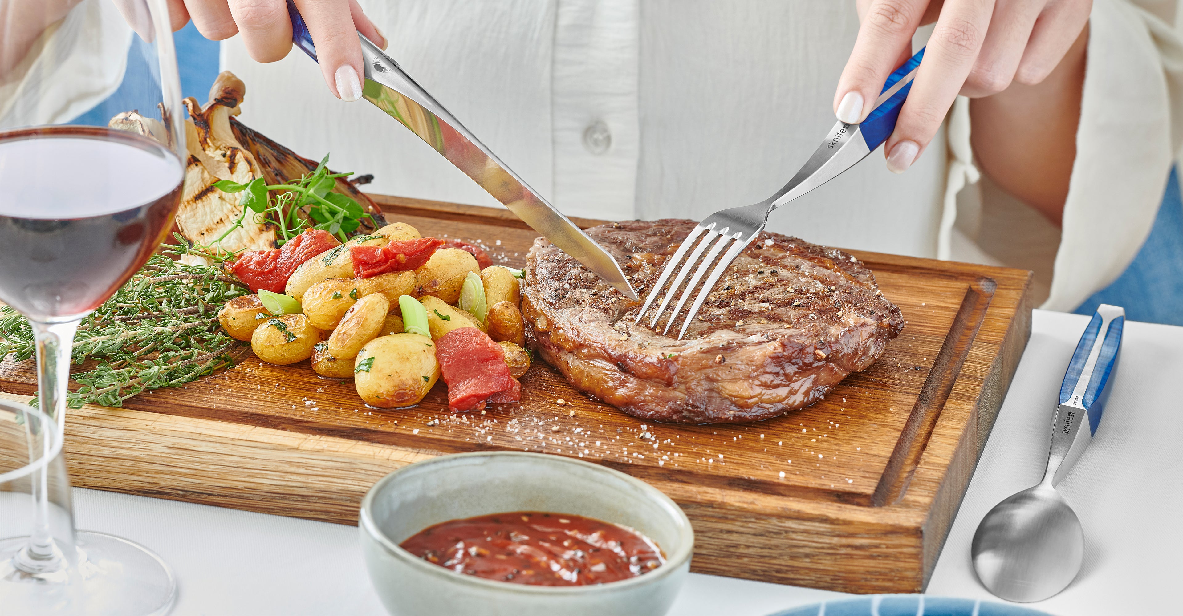 Crafted exclusively for Hotel du Cap-Eden-Roc, this Sknife 12-piece cutlery set includes four forks, spoons and steak knives featuring night blue driftwood handles in a captivating echo of the Mediterranean Sea off the coast of Cap d'Antibes. Designed in collaboration with world-renowned top chefs, the cutlery set features a seamless handle, creating an ergonomic hold and pleasurable dining experience.