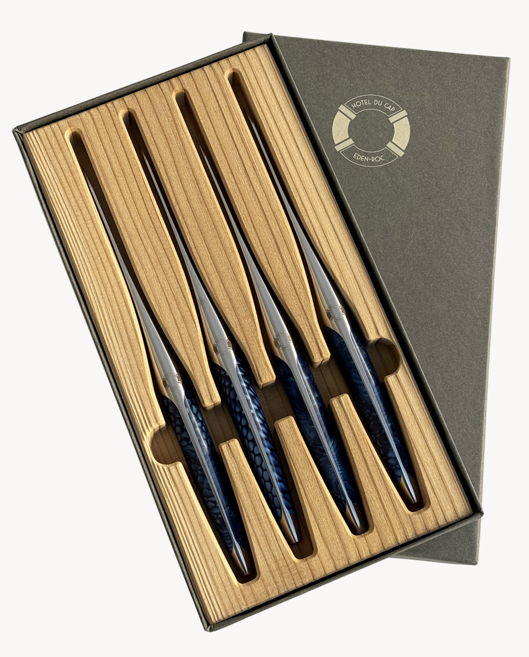 Crafted exclusively for Hotel du Cap-Eden-Roc, this Sknife 4-piece steak knife set features night blue driftwood handles in a captivating echo of the Mediterranean Sea off the coast of Cap d'Antibes. Designed in collaboration with world-renowned top chefs, the knife set features a seamless flow from handle to blade, creating an ergonomic hold and pleasurable cutting experience.