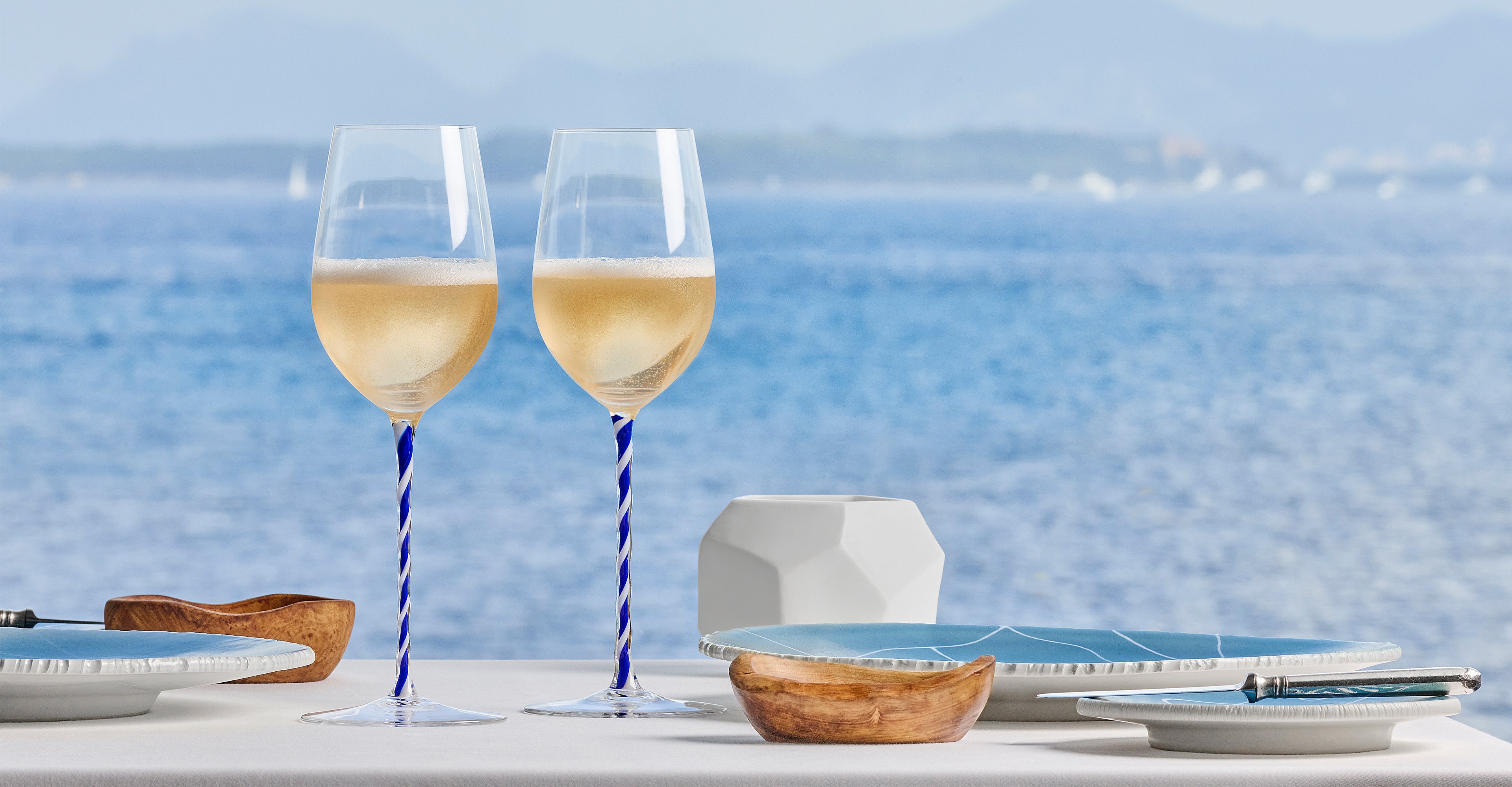 Finished with a delicate hand-blown glass stem in a blue and white spiral reminiscent of Hotel du Cap-Eden-Roc, the Riedel Fatto a Mano champagne glass is an exclusive design for lovers of the unique. Shaped to complement the effervescence of champagne and to allow the aromas to develop for optimum enjoyment, this glass set adds a touch of Riviera glamour to the table.