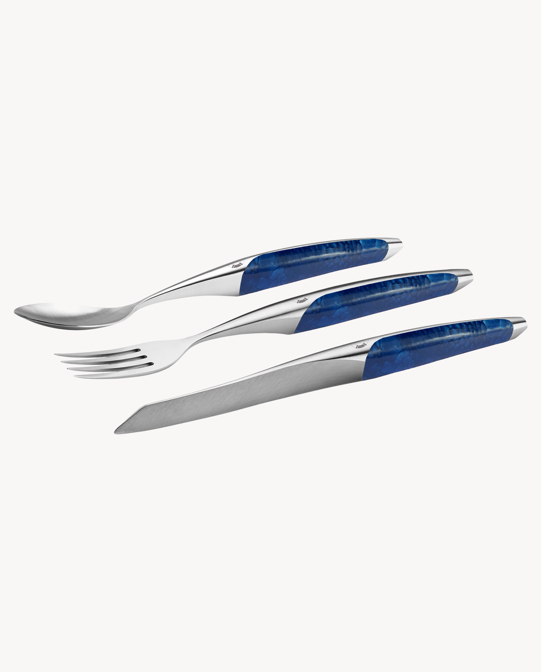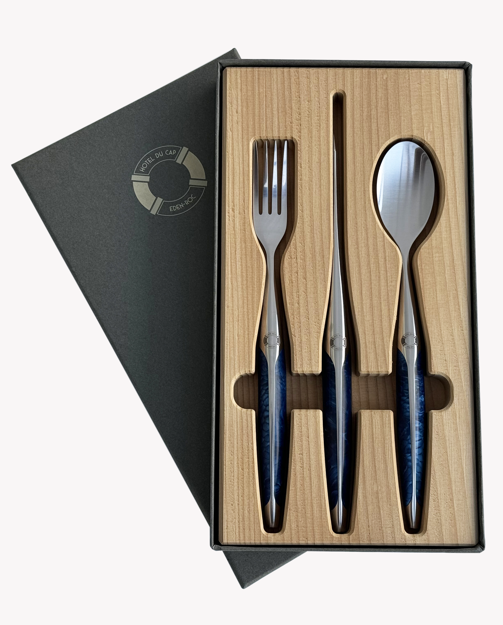 Crafted exclusively for Hotel du Cap-Eden-Roc, this Sknife steak cutlery set includes a fork, spoon and steak knife featuring night blue driftwood handles in a captivating echo of the Mediterranean Sea off the coast of Cap d'Antibes. Designed in collaboration with world-renowned top chefs, the cutlery set features a seamless handle, creating an ergonomic hold and pleasurable dining experience.